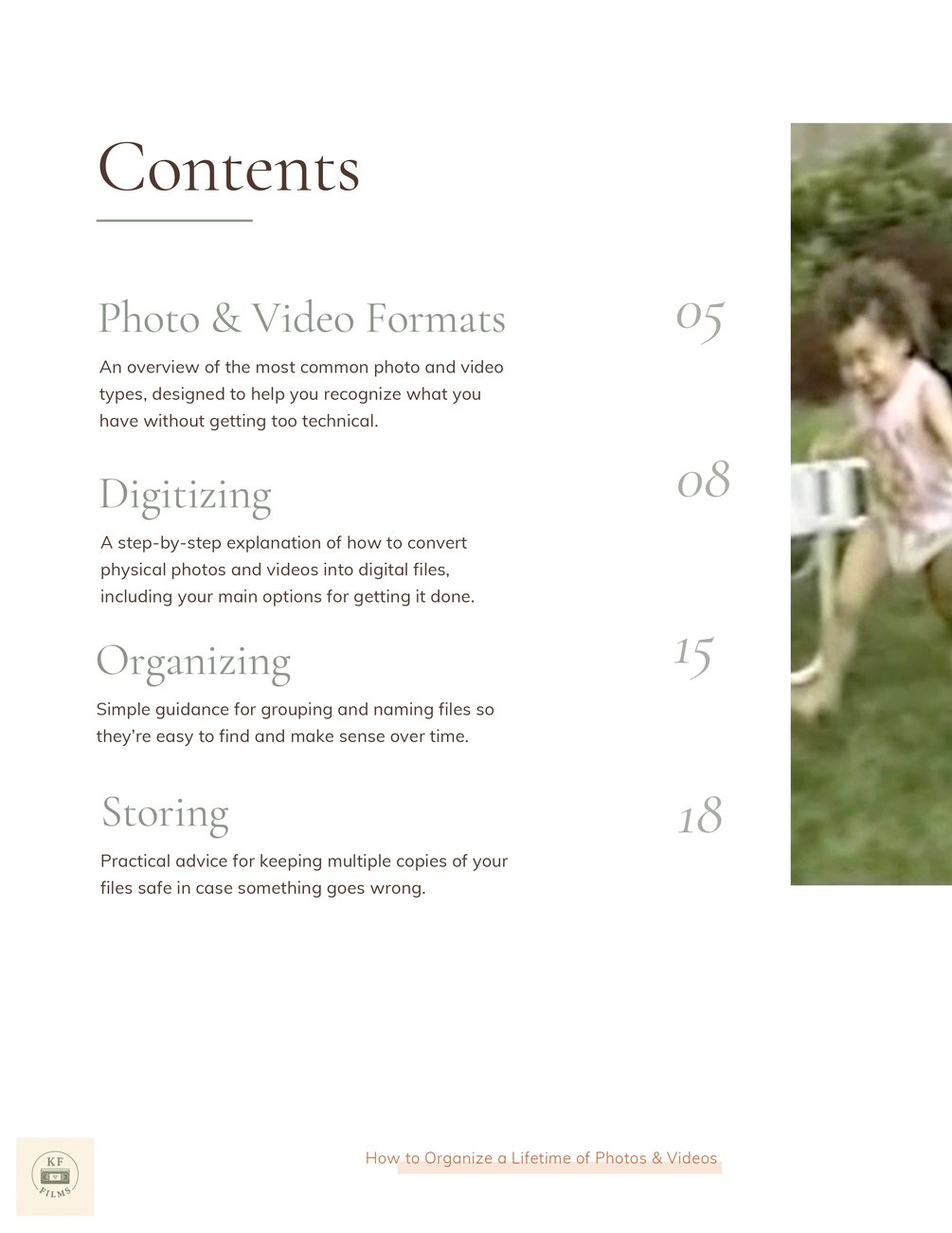 A calm, non-technical guide to organizing and digitizing family photos and videos. This downloadable PDF covers common photo and video formats, digitizing options (at home, local shops, or mail-in services), simple organization and naming systems, and practical guidance for safely storing and backing up your files over time.